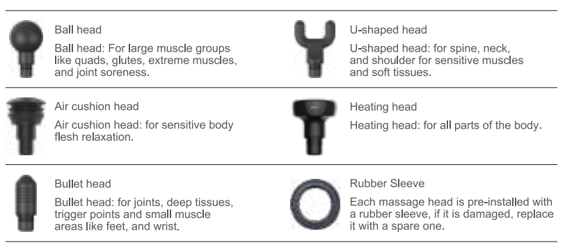 The RENPHO RP-GM171H comes with 6 different options for a head attachment on the tip of the massage gun. See a guide below to find out how to use each of them: